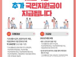코로나19가 지속되는 상황으로 경제적 어려움 등 생계의 위협을 받는 취약계층에 대한 두터운 보호를 위해 저소득층 296만 명에게 1인당 10만 원씩 추가 국민지원금을 8월 24일(화)에 지급된다.