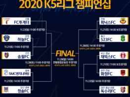 2020 K5리그 챔피언십이 11월 21일부터 29일까지 대전광역시 한밭종합운동장(주경기장 및 보조경기장)에서 열린다. 올해로 2회째를 맞이한 이번 챔피언십은 조별리그에 이은 4강 토너먼트로 진행된 지난해와 달리 10강 토너먼트로 시작된다. 10강 및 6강 토너먼트는 21일과 22일에 열리고, 준결승전은 28일, 대망의 결승전은 29일에 열린다.