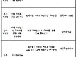 ①우주 수송기술 분야에 부산대학교, ②우주 통신기술 분야에 한국과학기술원(KAIST), ③우주 탐사 및 자원활용 분야에는 인하대학교가 선정되었으며, 자유공모 분야는 ①‘고신뢰성 저비용 저궤도 위성군 소요 위성시스템 핵심기술 연구센터’를 제안한 경상국립대학교와 ②‘미래 우주항법 및 위성기술 연구센터’를 제안한 세종대학교가 선정됐다.