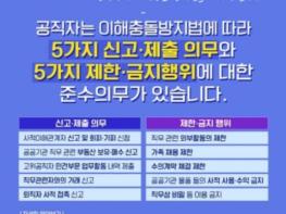 공직자는 이해충돌 방지법에 따라 5가지 신고·제출 의무와 5가지 제한·금지 행위에 대한 준수 의무가 있습니다.