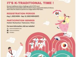 문화체육관광부 해외문화홍보원은 한국국제문화교류진흥원과 함께 8월 1일(월)부터 9월 12일(월)까지 ‘한류동호회와 함께하는 한국문화 함께 잇기(케이-커뮤니티 챌린지)’ 행사를 진행한다. 한류동호회를 대상으로 전통문화 4개 부문 온라인 공모전을 열어 우승팀을 선정하고 우승팀은 한국 무대에서 공연할 수 있는 기회를 제공한다.