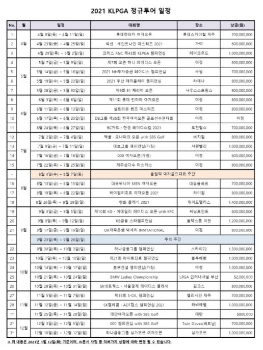 한국여자프로골프협회(KLPGA)가 2021년 KLPGA 정규투어 일정을 발표했으며, ‘대회 수 31개, 총상금 280억 원, 평균상금 약 9억 원’의 역대 최대 규모로 열린다고 밝혔다.