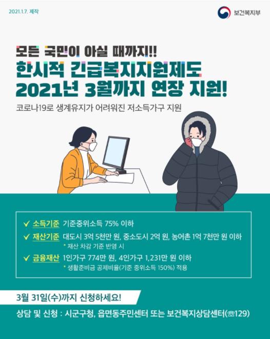 도움이 필요한 저소득 위기가구를 위해 3월 31일까지 ‘긴급복지지원’?연장합니다.