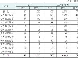 지역별 발주량을 보면 대전광역시 소재 본청 672억 원, 서울지방청 282억 원 등 2개청(954억 원)이 전체 금액(1,265억 원)의 75.4%를 차지하고 있으며, 인천 등 나머지 10개 지방청 311억 원이 각각 집행될 예정이다.