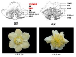 키위나무의 암수 구별은 잎이나 가지 모양으로는 구별이 어렵고 꽃 기관의 생김새로 확인해야 한다.