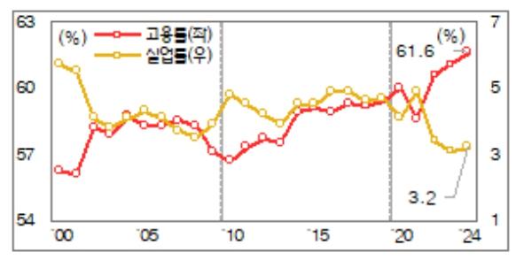 2024년 2월 15세 이상 고용률(61.6%)과 15~64세 고용률(68.7%)ㆍ경제활동참가율(63.6%) 모두 2월 기준 역대 최고를 기록했으며, 청년층부터 중장년층·고령층까지 고용률과 경제활동참가율이 고르게 상승했다.
