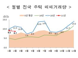 또한, 2021.2월까지 누계 주택 매매거래량은 177,700건으로 전년 동기(216,598건) 대비 18.0% 감소, 5년 평균(138,803건) 대비 28.0% 증가했다.