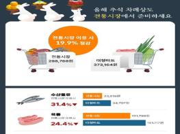 4인 기준 추석 차례상 준비 비용은 전통시장이 298,766원, 대형마트 373,164원으로, 전통시장이 대형마트에 비해 74,398원(19.9%) 저렴하며, 전체 27개 조사 품목 중 20개 품목이 전통시장에서 더 저렴한 것으로 조사됐다.