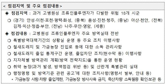 이번 점검은 지난 9월 12일 경기도 파주에서 과거보다 다소 이른 시기에 고병원성 조류인플루엔자가 가금농장에서 발생했고, 10월부터 겨울 철새가 본격 도래하면서 국내 추가 발생 가능성이 높아짐에 따라 선제적으로 농식품부, 행정안전부, 농림축산검역본부, 시도 관계관 합동으로 점검반을 구성하여 실시하는 것이다.