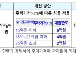수도권·규제지역에 적용되는 주택구입목적 주담대의 대출한도(現 6억원)를 주택가격(시가) 수준에 따라 차등 적용한다. 수도권 · 규제지역의 ➊시가 15억원 이하 주택의 주담대 한도는 현행과 동일한 6억원, ➋시가 15억원 초과~25억원 이하 주택은 4억원, ➌시가 25억원 초과 주택은 2억원으로 대출한도를 차등 적용한다. 이를 통해 수도권·규제지역 내에서 대출을 활용한 고가주택 구입 수요를 보다 강력하게 관리해 나갈 예정이다.