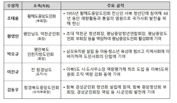 한편, 이번 대회에서는 올해 ‘국가사회발전 이북도민 유공’ 정부포상자로 선정된 39명 중 5명의 유공도민에게 국민훈장 동백장이 수여된다.