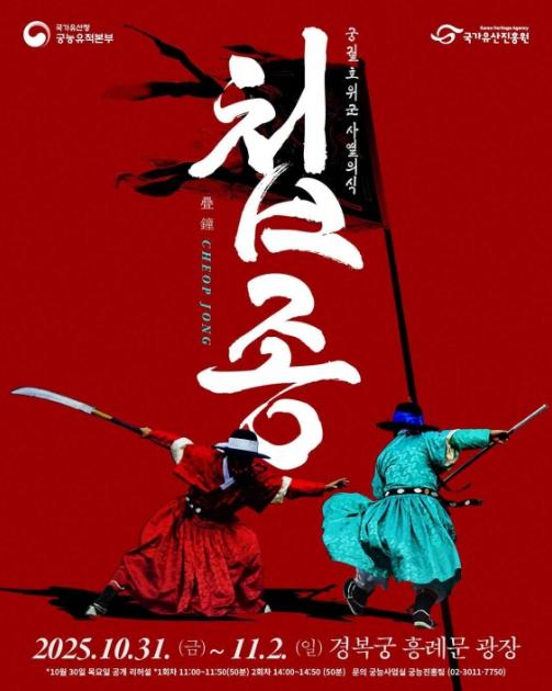 국가유산청 궁능유적본부는 국가유산진흥원과 함께 10월 31일부터 11월 2일까지 하루 2회(오전 11시, 오후 2시) 경복궁(서울 종로구) 흥례문 광장에서 '2025년 궁궐 호위군 사열의식 ‘첩종(疊鐘)’' 행사를 개최한다.