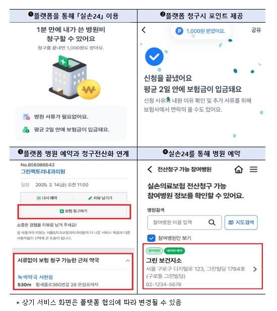국민 대다수가 이용하는 온라인 플랫폼(네이버, 토스 등)을 이용하여 청구전산화 서비스를 쉽게 이용할 수 있게 하는 데도 노력을 기울일 계획이다. 전산개발을 거쳐 빠르면 ’25.11월부터 ➊플랫폼 앱을 통해 「실손24」 서비스를 동일하게 이용 가능하며, 실손24 앱 설치 없이도 가입 보험사 조회부터 보험금 청구까지 플랫폼 내에서 모든 과정을 진행할 수 있게 된다. ➋플랫폼을 통한 「실손24」 청구건에 대하여는 소비자에게 별도로 포인트 캐시백을 제공*할 예정이다. ➌또한, 향후 플랫폼이 제공하고 있는 고유 서비스(예: 병원 예약)와도 연계하여 병원 예약부터 보험금 청구까지 One-stop으로 진행할 수 있도록 서비스를 보다 편리하게 개선할 계획이다. ➍한편, 「실손24」를 통해서도 플랫폼(예: 네이버)의 병원 예약 서비스를 이용할 수 있는 상호간 서비스 연계는 이미 활용할 수 있다.