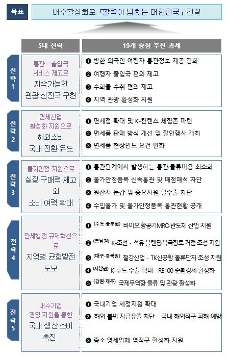 이번 대책은 ①통관·출입국 서비스 제고, ②면세산업 활성화, ③물가안정, ④지역별 특화산업 지원 및 ⑤내수기업 경영 지원을 주요 내용으로 한다.
