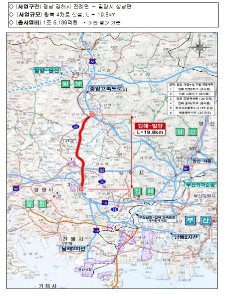 ➊김해~밀양 고속도로 신설은 경남 김해시 진례면 ~ 밀양시 상남면 19.8㎞ 구간 왕복 4차로를 신설하는 사업(총사업비 1.6조원)으로, 부산항신항 및 가덕도신공항의 접근성을 제고하고 대구·경남 지역 산업단지 물류 경쟁력 강화에 기여할 것으로 기대된다.
