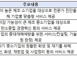 기업의 특성과 필요에 따라 4가지 유형(①일반, ②탄소중립, ③중대재해예방, ④재기컨설팅)으로 구분하며, 유형별로 기업 특성에 맞춘 3개 서비스(컨설팅·기술지원·마케팅)를 바우처 방식으로 지원할 예정이다.
