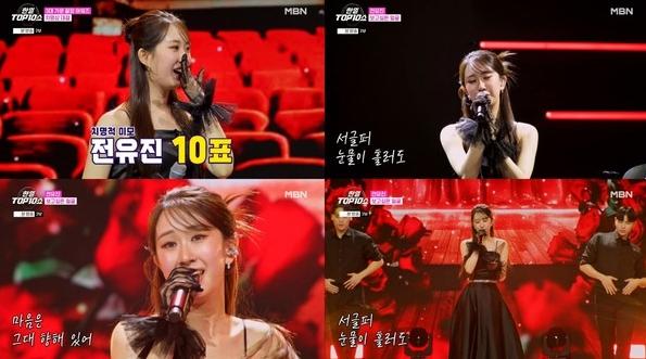전유진은 지난 2일 밤 방송된 MBN ‘한일톱텐쇼’에 출연했다. 이날 방송은 연말 특집으로 진행됐으며, ‘3대 가문 끝장 어워즈’를 주제로 ‘현역가왕1’, ‘현역가왕2’, ‘현역가왕 재팬’의 주역들이 총출동해 풍성한 무대를 꾸몄다.