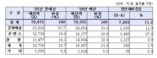 문화체육관광부는 2026년도 문체부 예산이 7조 8,555억 원으로 최종 확정되었다고 밝혔다. 이는 올해 본예산 대비 7,883억 원(11.2%)이 증가한 규모이다. 문체부는 이번 예산을 ‘케이-컬처’ 300조 원 시대 출발을 위한 예산으로 콘텐츠산업의 국가전략산업화, 국민이 함께 누리는 관광 등에 주력해 편성했다고 밝힌 바 있다.