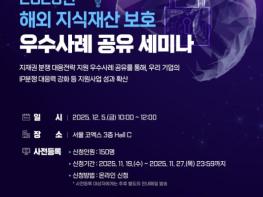지식재산처는 12월 5일 10시 코엑스(서울시 강남구)에서 ‘2025년 해외 지식재산 보호 우수사례 공유 세미나’를 개최한다. 이번 행사는 2025 대한민국 지식재산대전의 일부 행사로 진행되며, 우리 기업이 해외 시장에서 자주 마주하는 지식재산 분쟁에 효과적으로 대응할 수 있게 실제 우수 사례와 대응 전략을 공유하는 자리로 마련됐다.