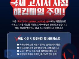 최근 '국세 고지서.pdf(tax_notice).zip'이라는 파일명으로 국세고지서를 사칭한 악성코드가 이메일로 유포되고 있습니다. 해당 파일을 열람하지 말고 즉시 삭제하시기 바랍니다.