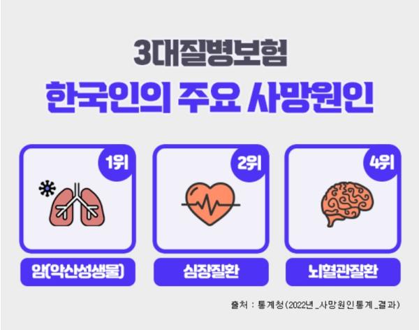흔히 3대질병이라 일컫는 암, 심혈관질환, 뇌혈관질환은 통계청 발표자료에 따르면 한국인의 주요 사망원인 중에서 3위 폐렴을 제외하고 1~4위를 차지하고 있으며, 이전부터 지금까지도 살면서 가장 먼저 대비해야 하는 치명적인 질병으로 강조되고 있다. 이러한 중대질병에 대비하기 위하여 상기 세가지 치명적인 질병을 집중보장하는 3대질병진단비보험을 많이 가입하고 있다. 3대진단비보험은 각각의 질병을 중점적으로 보장하면서도 가입자 특성에 맞는 특약을 추가함으로써 종합건강보험으로도 활용할 수가 있다.