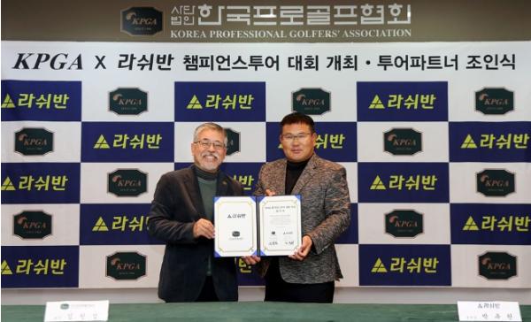 ㈜한국프로골프투어(대표이사 김원섭,KPGT)와 라쉬반(대표이사 백경수)이 KPGA 챔피언스투어 대회 개최 협약을 체결했다.