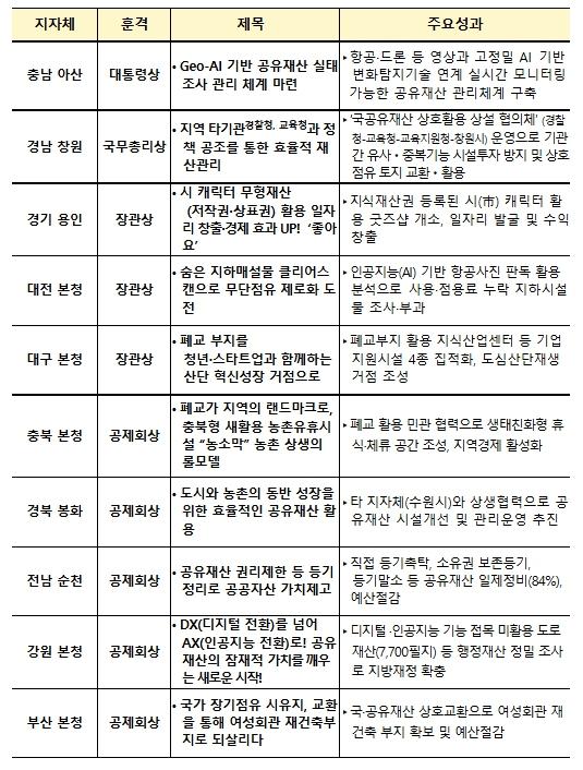 공유재산 경진대회 우수사례로 선정된 10개 지방정부는 다음과 같다.