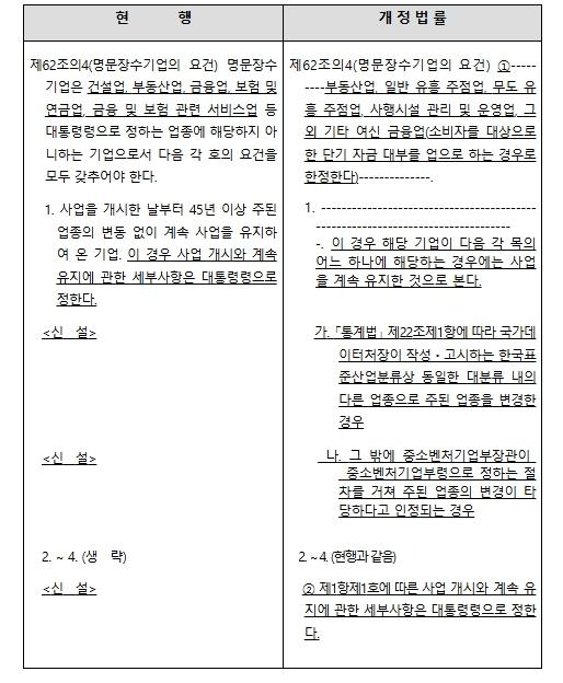 이에 개정안을 통해 주된 업종 유지 기준을 ‘세분류’에서 ‘대분류’로 완화하고, 대분류간 변경이 발생하더라도 중기부가 정하는 절차를 거쳐 타당성이 인정되면 주된 업종을 유지한 것으로 인정하도록 개선했다.