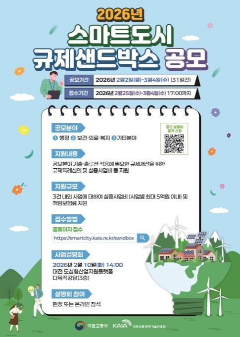 국토교통부는 스마트도시 기술·서비스의 규제 완화 및 해소를 지원하는 스마트도시 규제샌드박스 실증사업 공모를 추진한다.