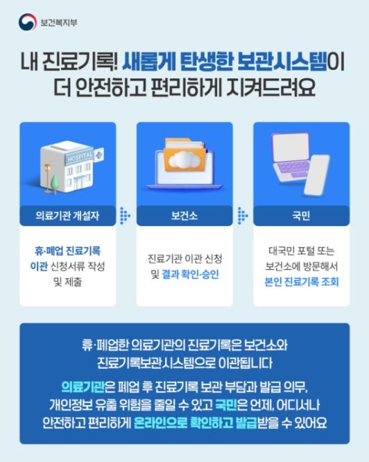 보건복지부와 한국보건의료정보원은 다니던 병원이 문을 닫아도 국민이 자신의 진료기록을 보다 편하게 확인할 수 있도록 휴·폐업 의료기관 진료기록보관시스템 개선을 추진한다고 밝혔다.