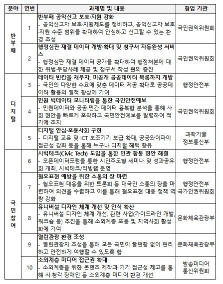 대한민국 정부는 2011년 국제협의체인 ‘열린정부파트너십(OGP)’에 가입한 이래, 정부 개방과 반부패, 국민참여 증진을 위한 실행계획을 꾸준히 이행하고, 관련 성과를 국제사회와 공유해 왔다.