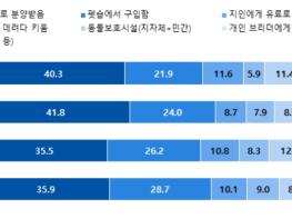 반려동물 입양경로는 지인을 통한 분양(유료·무료)이 46.0%로 가장 많았고, 펫숍에서 구입함(28.7%), 길고양이 등을 데려다 키움(9.0%) 순으로 나타났다.