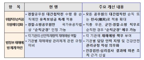 경찰·소방이 아닌 공무원도 군인, 경찰, 소방의 직무로 순직(위험직무)한 경우, '국가유공자법'상 순직군경으로 예우할 수 있도록 절차와 근거도 마련된다.