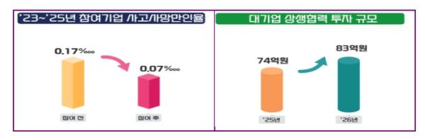 올해는 대기업 220곳이 중소기업 3,160곳과 함께 참여한다. 상생협력 투자 금액은 지난해보다 11.3%(74→83억 원) 증가할 예정이고, 사망·중상해 재해가 발생한 고위험 협력업체, 거래관계가 없는 지역 중소기업 등 안전관리 손길이 필요한 분야에 대한 지원을 강화한다.