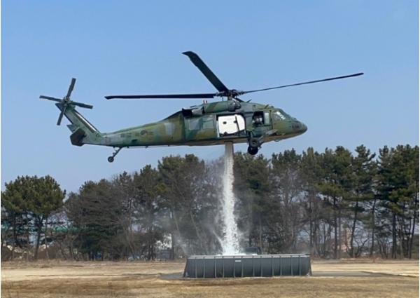 방위사업청은 대형산불이라는 재난위기 속에서 군용헬기의 화재 진화 능력 강화를 위해 지난해 UH-60 헬기 화재진화장비의 성능을 개선했다. 기존의 외부 장착형 1,600리터 용량의 밤비바켓을 기체 내부에 탈·부착이 가능한 3,218리터의 대용량 물탱크로 교체하여 헬기 이동 및 진화 작전 간 안전사고의 위험성을 감소시키고, 전자식 제어 투하장치를 적용하여 화재지점으로의 투하 정확도를 높였다.