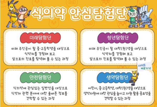 견학 프로그램은 대상별 눈높이에 맞춰 ▲중·고등학생 대상 ‘식의약 미래탐험단(실험실 견학, 시험분석 실습)’ ▲대학생 대상 ‘식의약 청년탐험단(시험분석 실습, 해썹 교육, 약대생 공직체험)’ ▲일반 국민 대상 ‘식의약 안전탐험단(식의약 안전정보 제공)’ ▲영유아 및 초·중·고·대학생 대상 ‘식의약 생약탐험단(생약 자원 소개)’으로 구성했다.