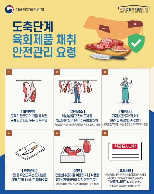식약처는 생식용 식육의 안전관리를 위해 생산(도축장) 부터 제조·유통·소비 단계별 안전관리를 위해 '생식용 식육 제품 안전관리 가이드라인'을 마련하여 축산물위생교육기관, 관련 협회 등을 통해 업계에 지속적인 교육·홍보를 하고 있다.