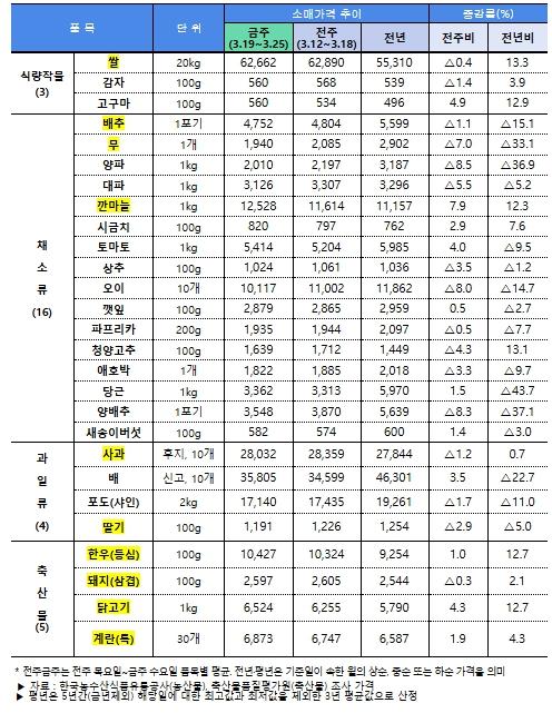 점검 결과, 농산물은 대부분 품목이 전년대비 낮은 수준이며, 전주대비 하락세로 아직까지 중동전쟁에 따른 가격 영향은 미미한 것으로 나타났다. 가격이 낮은 당근, 양배추, 양파 등에 대해서는 수급안정대책을 추진 중이며 소비촉진(할인지원 등)도 병행 추진하고 있다.