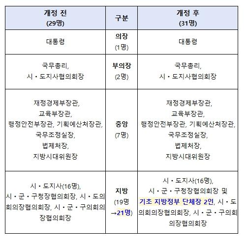 시행령 개정의 주요 내용은 협력회의 내 기초 지방정부 단체장 구성원이 기존 1명에서 3명으로 총 2명을 확대하는 것이다.