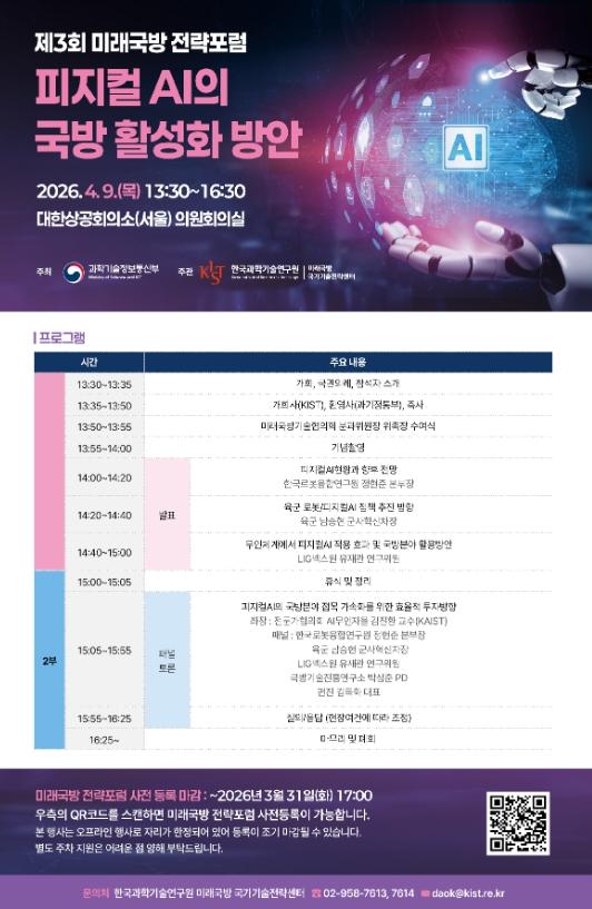 과학기술정보통신부는 한국과학기술연구원(원장 오상록)과 함께 4월 9일 대한상공회의소에서 제3회 미래 국방 전략 토론회(전략 포럼)(‘물리적 인공지능'피지컬AI'의 국방 활성화 방안’)을 개최했다고 밝혔다.
