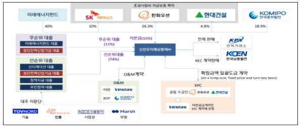 신안우이 해상풍력 발전사업은 총 3.4조가 소요되는 전체 사업비 중 5,100억원은 자기자본으로, 2조 8,900억원은 타인자본으로 조달된다.