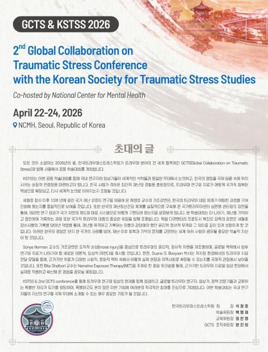 이번 학술대회는 글로벌 트라우마 스트레스 협의체 (GCTS)와 한국트라우마스트레스학회(KSTSS), 국립정신건강센터가 공동 주최하는 행사로, 외상 후 스트레스, 재난 정신건강, 근거기반 치료 확산, 지역사회 회복, 국제협력 방안 등을 논의한다.