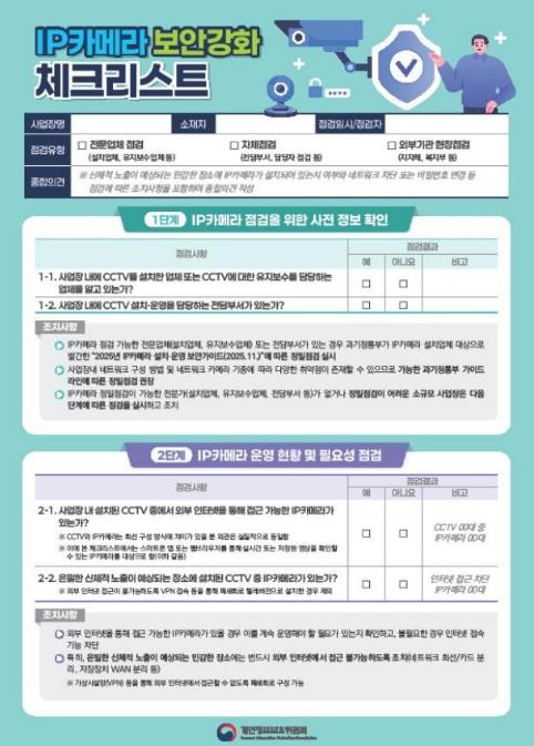 이에 개인정보위는 소규모 사업장 등에서 이행할 수 있는 ‘IP카메라 점검 체크리스트’를 마련한다. 또한, 관계부처(문화체육관광부, 보건복지부 등), 지방자치단체, 주요 직능단체 등과 협력하여 공공시설물, 의료기관, 소규모 사업장(헬스장, 노래방 등) 등에 대한 IP카메라 자율점검 및 보안조치 이행을 적극 추진한다.