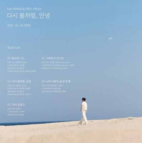 이민혁은 26일 오후 6시 공식 SNS 채널을 통해 EP '다시 봄처럼, 안녕'의 트랙 리스트를 공개했다. 공개된 트랙 리스트에 따르면, 타이틀 곡 '목소리'를 포함해 '사랑하고 있나요', '다시 봄처럼, 안녕', '너의 사랑이 날 웃게 해', '우리 손잡고'까지 총 5곡이 수록됐다.