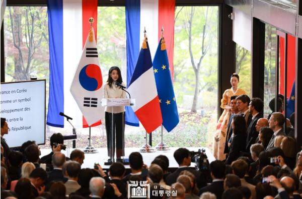 김 여사는 주한프랑스대사관이 “한국의 얼과 프랑스 고유의 매력이 절묘하게 어우러진 건축물”이라며 개관을 축하했다. 특히 김 여사는 지난 ‘르 꼬르뷔지에’ 한국특별전 준비 당시 프랑스 대사관의 많은 도움을 받은 인연을 소개하면서, 개인적으로 주한프랑스대사관을 르 꼬르뷔지에를 사사한 유일한 한국건축가 김중업 선생이 설계했다는 점에서 이번 개관이 더욱 특별하게 느껴진다고 전했다. 이어 신축한 업무 건물에 한국전쟁 참전용사의 이름을 새긴 것을 보았다면서, “오늘의 대한민국을 있게 한 참전용사분들의 고귀한 희생과 헌신을 결코 잊지 않을 것”이며 “양국이 오랜 우정을 바탕으로 미래지향적 관계로 발전하기 바란다”고 당부했다.
