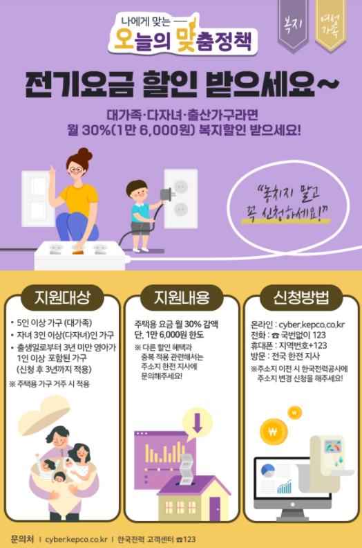 대가족·다자녀·출산가구라면 월 30%(1만 6000원 한도) 전기요금 복지 할인 꼭 받으세요!