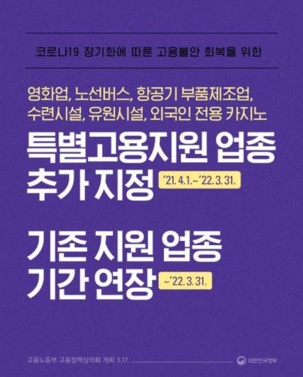 - 특별고용지원 업종 추가 지정 : 2021.4.1.~2022.3.31.