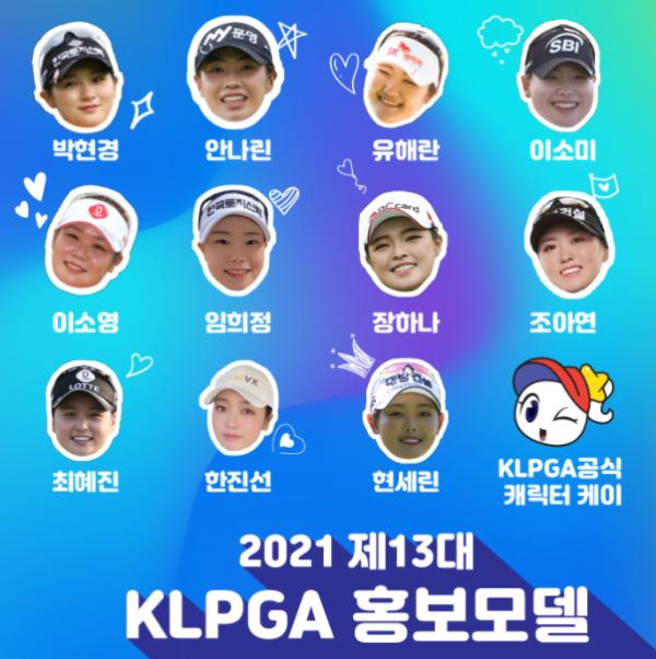 제13대 KLPGA 홍보모델은 △박현경(21,한국토지신탁), △안나린(25,문영그룹), △유해란(20,SK네트웍스), △이소미(22,SBI저축은행), △이소영(24,롯데), △임희정(21,한국토지신탁), △장하나(29,비씨카드), △조아연(21,동부건설), △최혜진(22,롯데), △한진선(24,카카오VX), △현세린(20,대방건설) 등 2021시즌 정규투어에서 활약할 총 11명의 선수들로 결정됐다. 또한, KLPGA 캐릭터 ‘케이’도 제13대 KLPGA 홍보모델 역할을 맡아 활동한다.