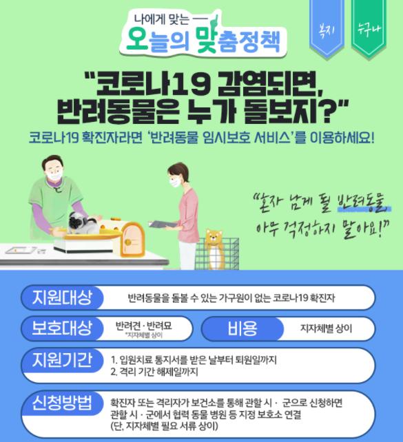 - 코로나19 확진자 중 반려동물을 돌볼 수 없는 경우 임시 위탁관리 할 수 있도록