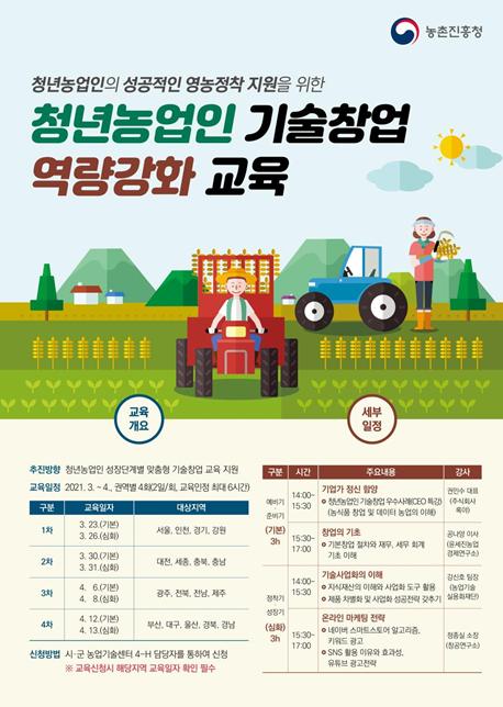 농촌진흥청은 농산업 분야 창업을 계획하고 있거나 창업 초기단계에 있는 청년농업인을 대상으로 실무지식 습득을 위한 ‘기술창업 역량강화 교육’을 추진하고 있다.